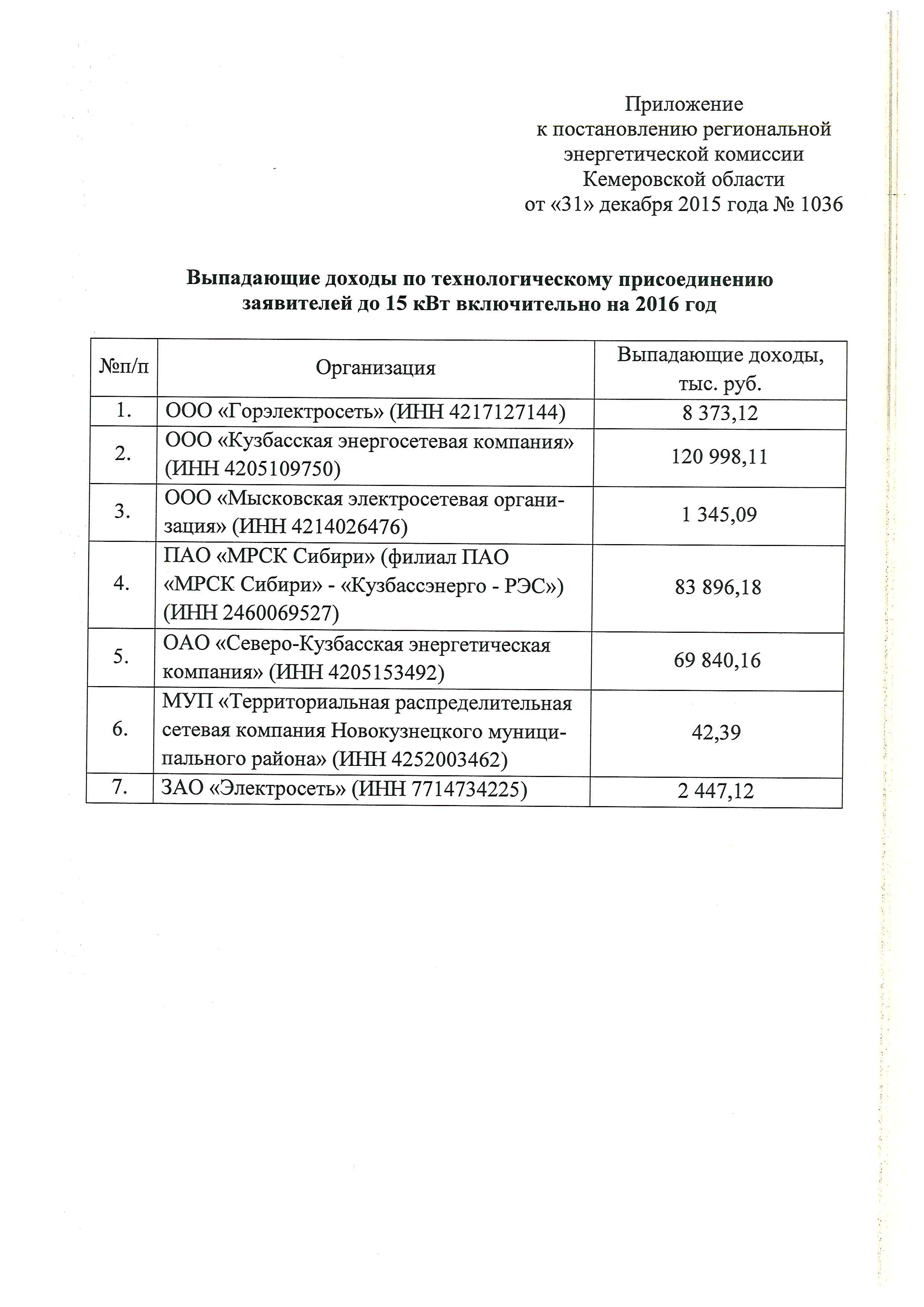 Выпадающие доходы по технологическому присоединению заявителей до 15 кВт включительно на 2016 год
