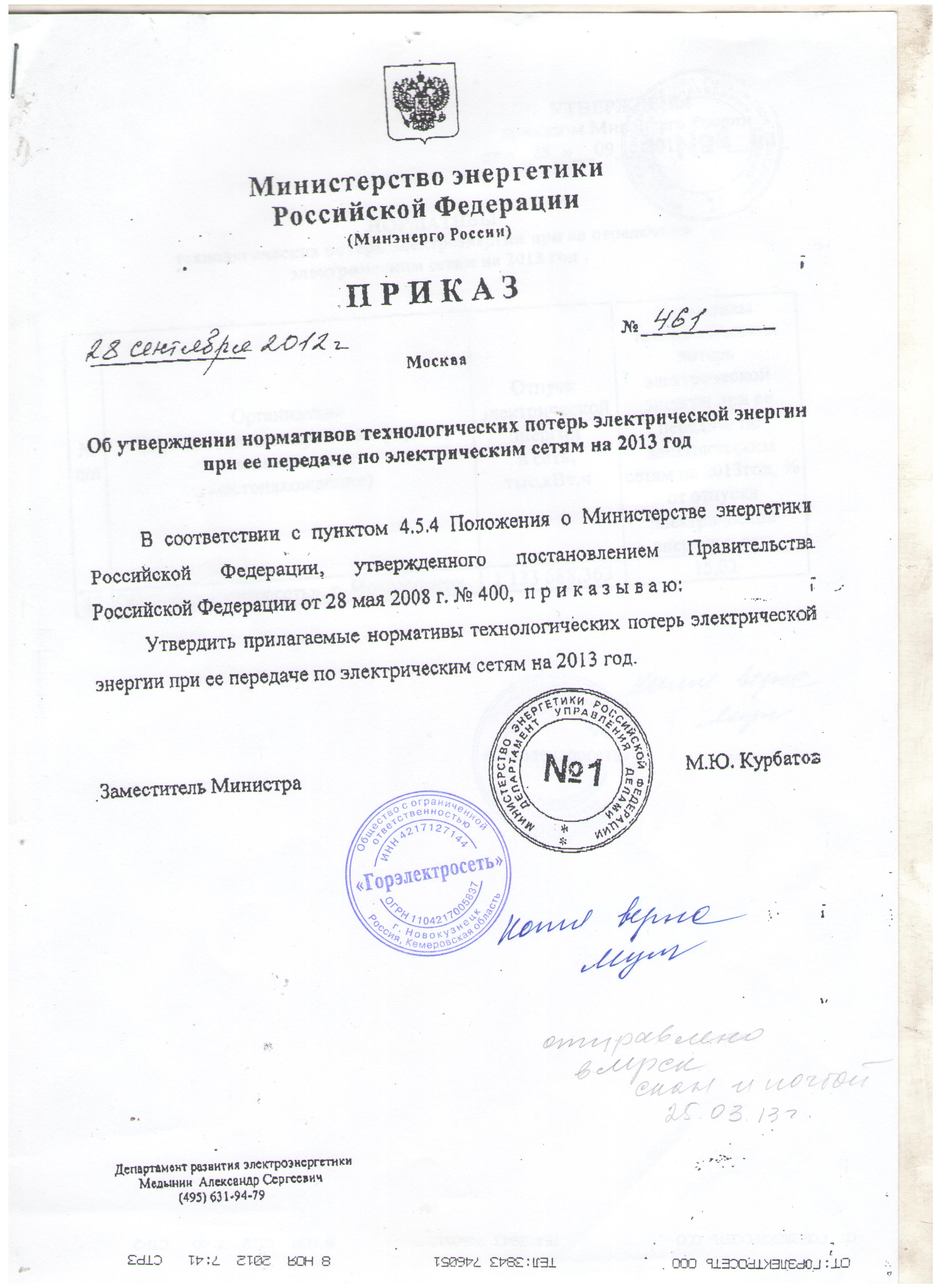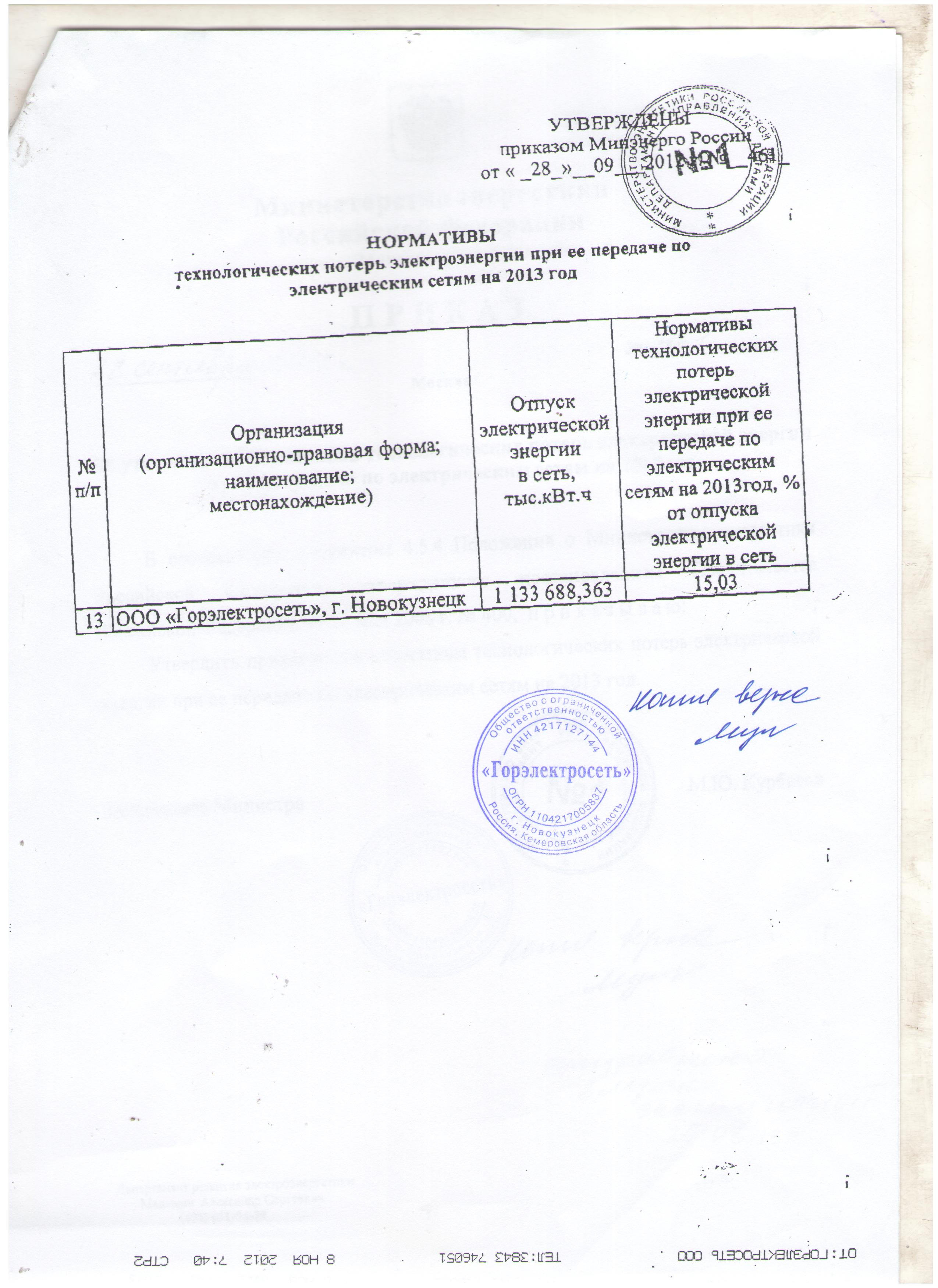 Приказ минэнерго о величиние нормативных потерь ГЭС 2013 лист1 |